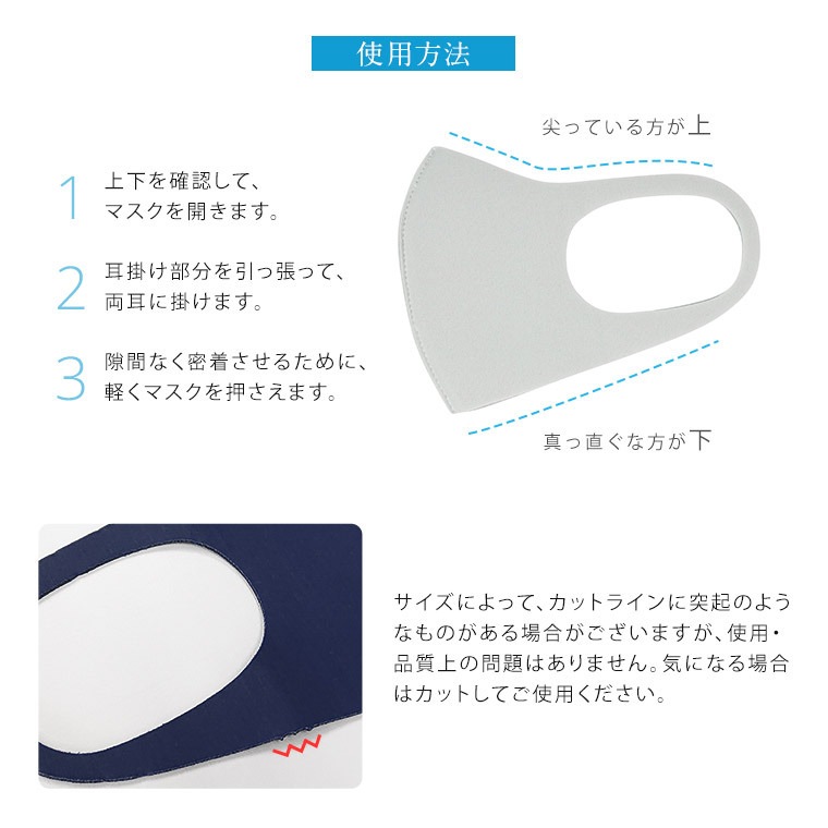 1.マスクを取り出し、上下を確認して(尖っている方が上)左右に広げます。