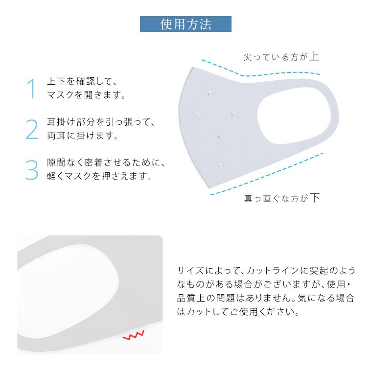 1.マスクを取り出し、上下を確認して(尖っている方が上)左右に広げます。