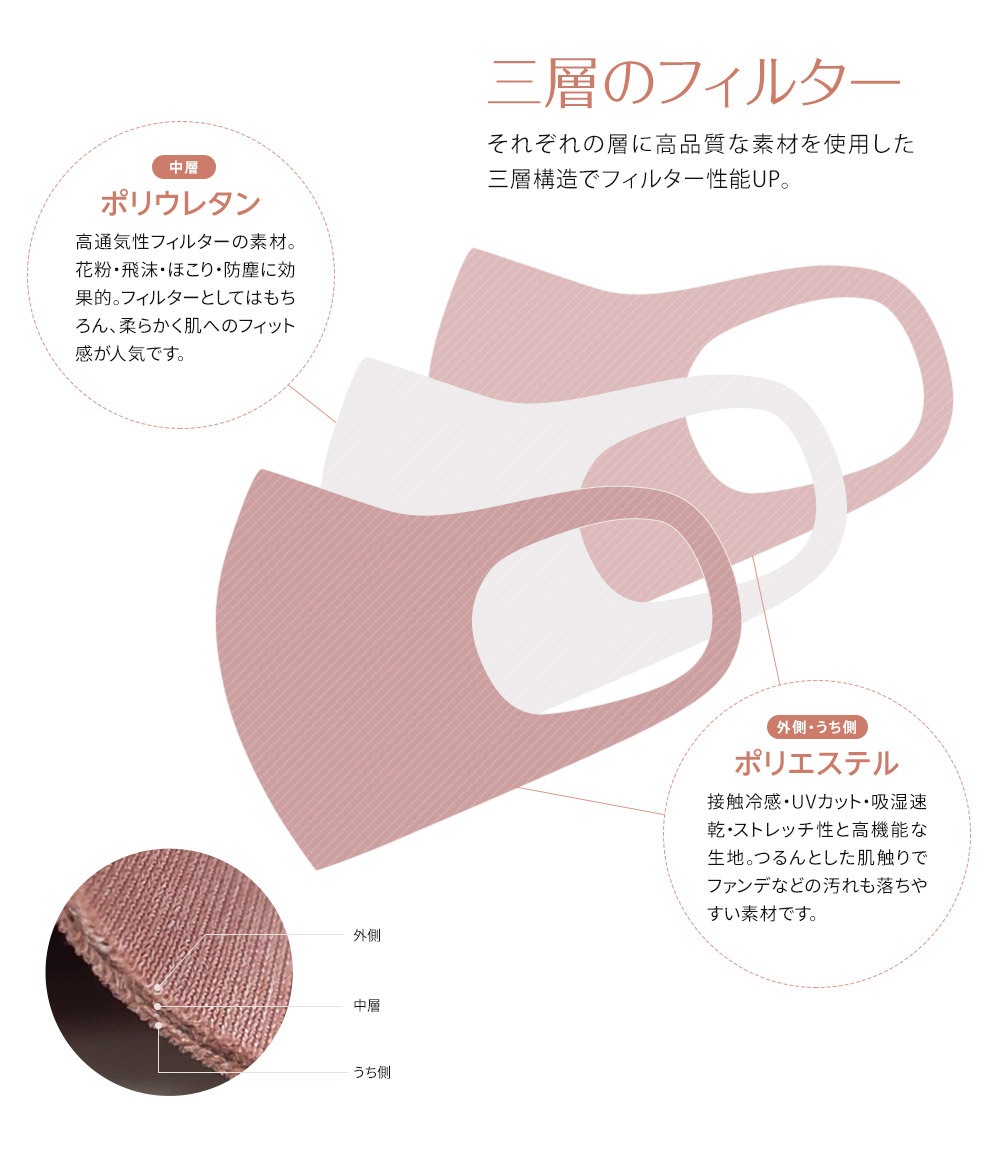 中地 : 高通気性フィルターのポリウレタン素材。 花粉 / 飛沫 / ほこり / 防塵 に効果的。