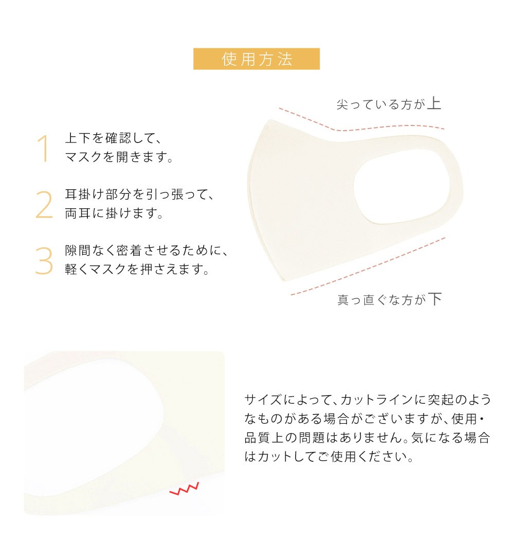 1.マスクを取り出し、上下を確認して(尖っている方が上)左右に広げます。
