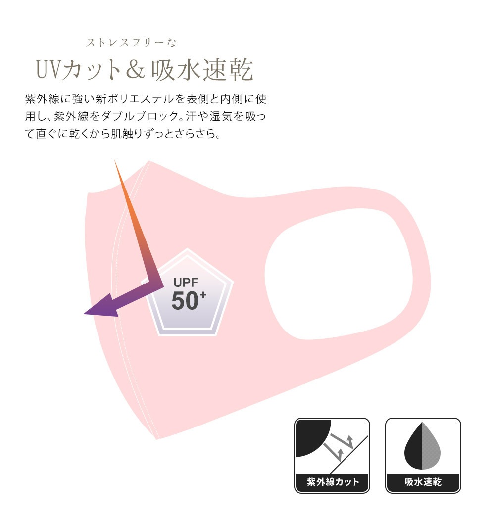 表地と裏地 : 美肌効果 / 保湿効果 / 吸湿速乾 / 保温効果 / 静電気防止 / UVカット UPF+50 / ストレッチ / 抗菌 / 防臭 / 消臭