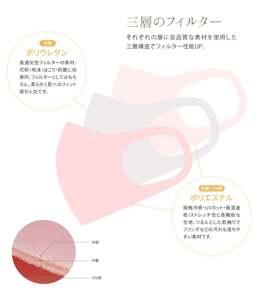 中地 : 高通気性フィルターのポリウレタン素材。 花粉 / 飛沫 / ほこり / 防塵 に効果的。