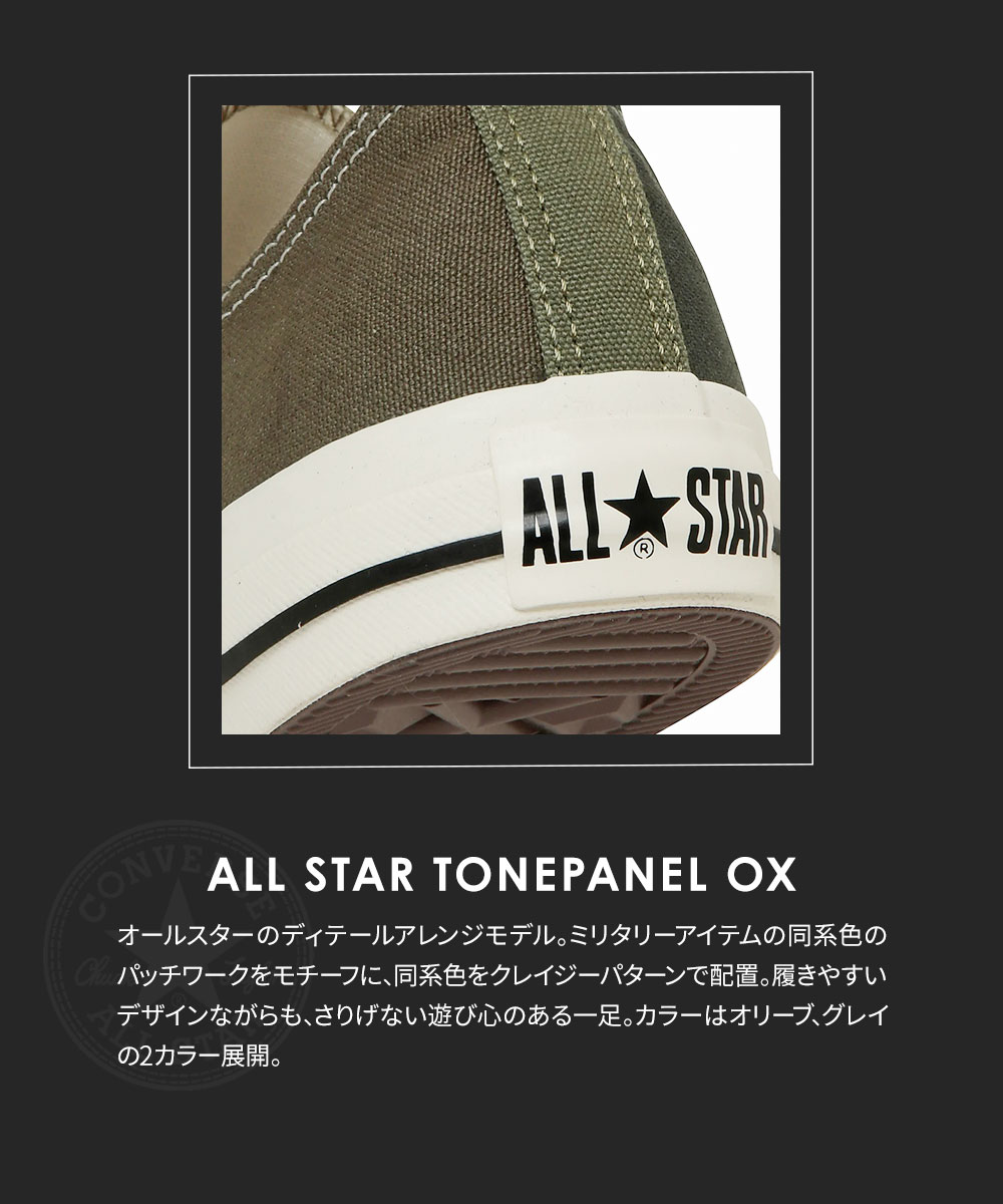 コンバース オールスター 靴 定番シューズ 正規品 国内正規品 日本 正規代理店品 ブランド ギフト 贈り物 お祝い 誕生日 プレゼント 小さいサイズ 大きいサイズ コンバース スニーカー カジュアルシューズ ローカット 白スニーカー ファッションコーデ スリッポンデザイン ストリートスタイル スポーツミックス コンバース オールスター ローカット ox トーンパネル レディース メンズ 男女兼用 ユニセックス カジュアル おしゃれ 春 夏 秋 冬 ローカットスニーカー キャンバスシューズ スニーカー 靴 シューズ グレイ オリーブ converse ALL STAR TONEPANEL OX