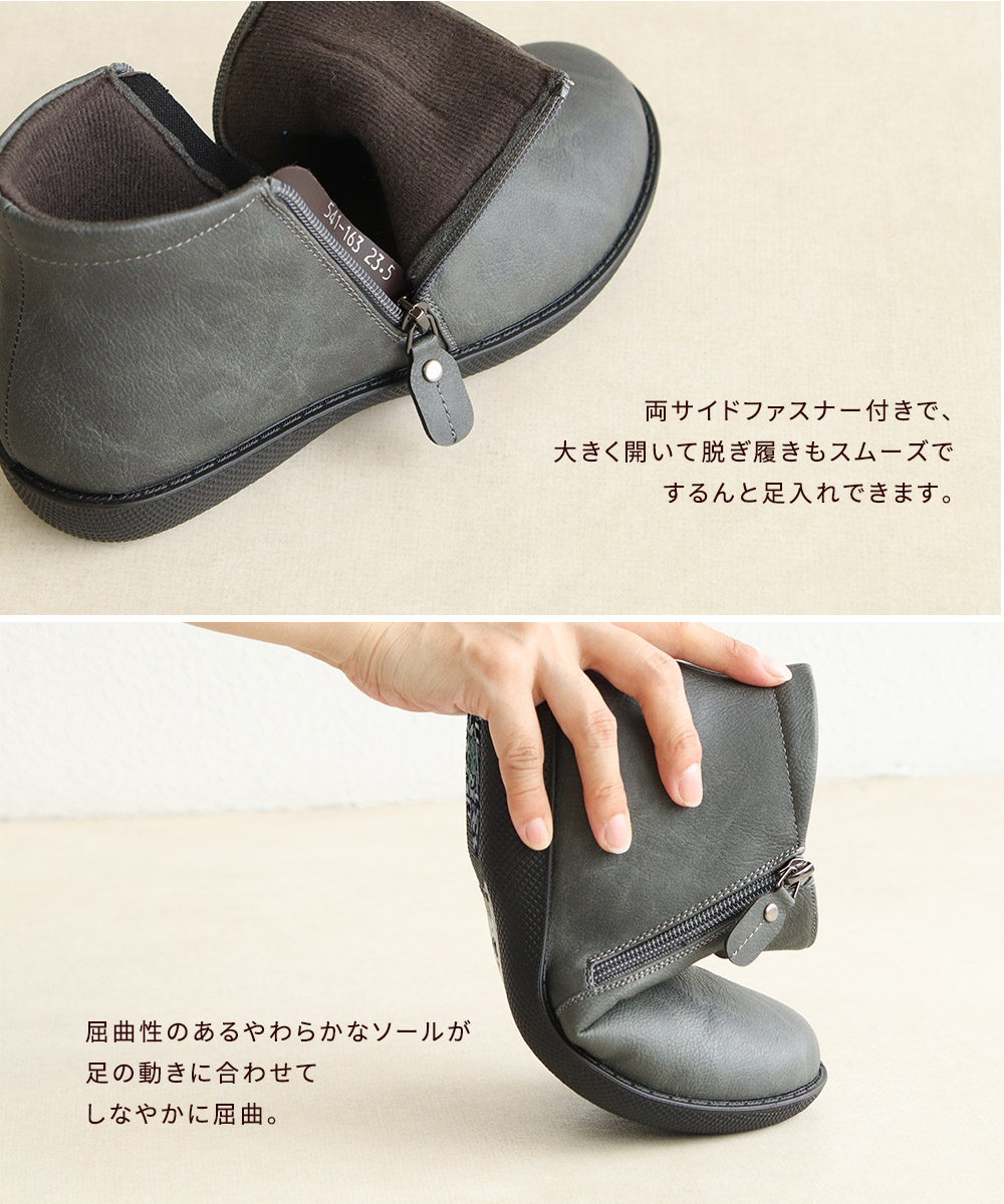 両サイドファスナー付きで、大きく開いて脱ぎ履きもスムーズでするんと足入れできます。