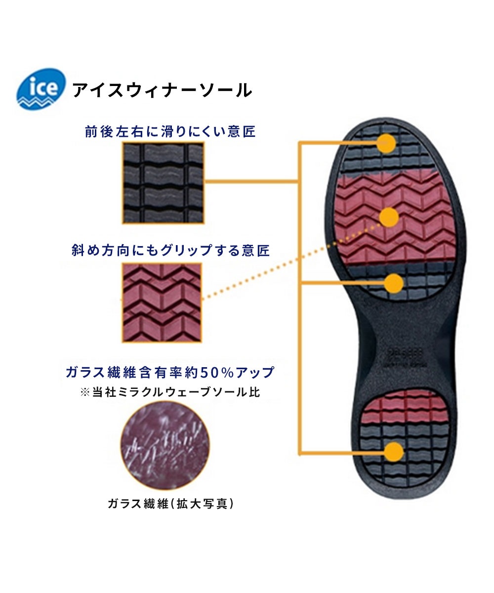 防滑ラバーの全面に大量のガラス繊維を配合し、滑りやすいアイスバーンでも他を圧倒するグリップ力を誇る