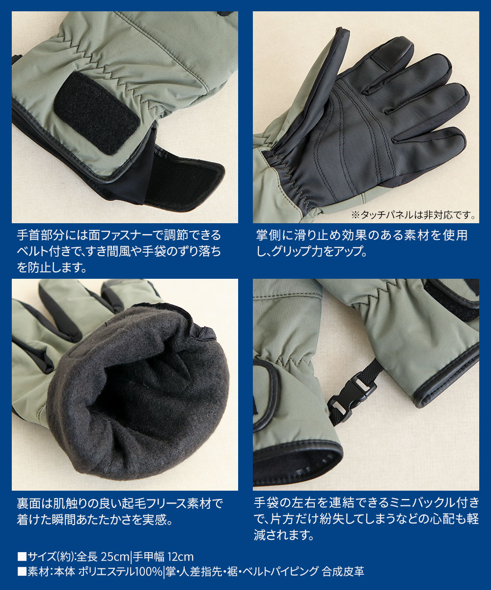 手袋の左右を連結できるミニバックル付きで、片方だけ紛失してしまうなどの心配も軽減されます。