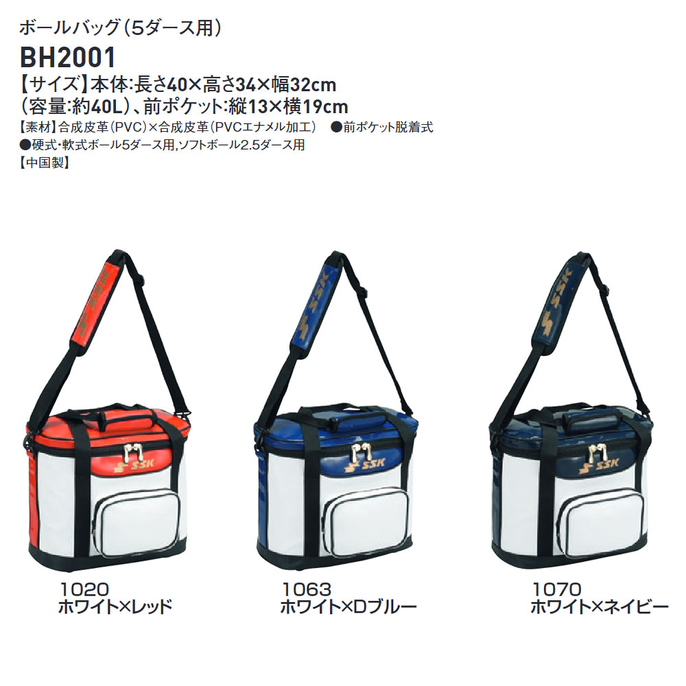 SSK 野球 バッグ ショルダー ボール入れ ボールケース 練習 大容量 60球収納 前ポケット 着脱式 硬式 軟式 フロントポケット付き エスエスケイ bh2001