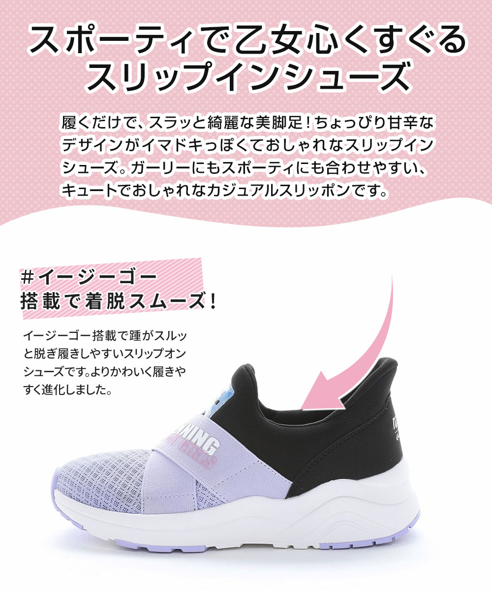 軽くなるよう工夫を施した設計です。イージーゴー搭載で踵がスルッと脱ぎ履きしやすいスリップオンシューズです。よりかわいく履きやすく進化しました。